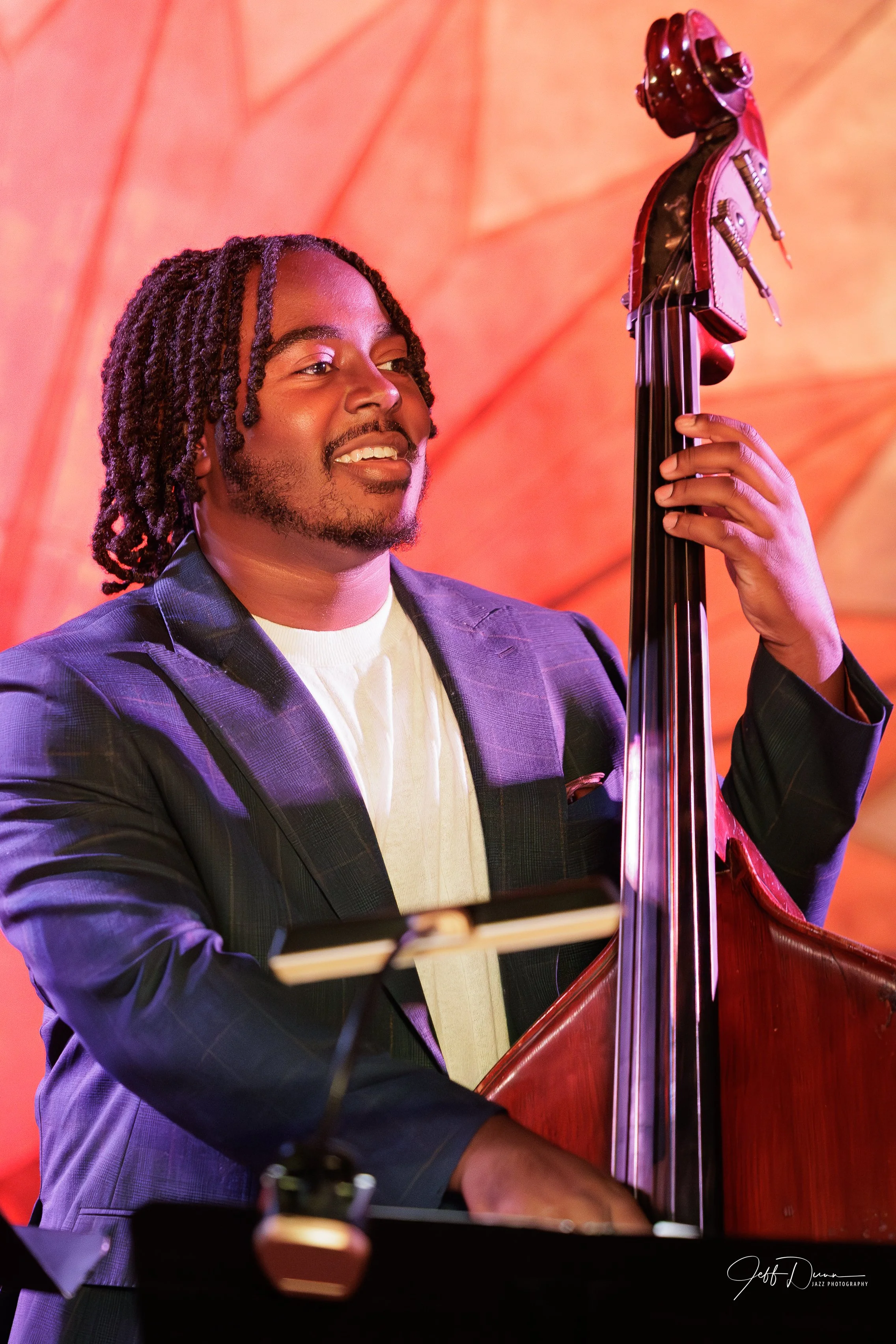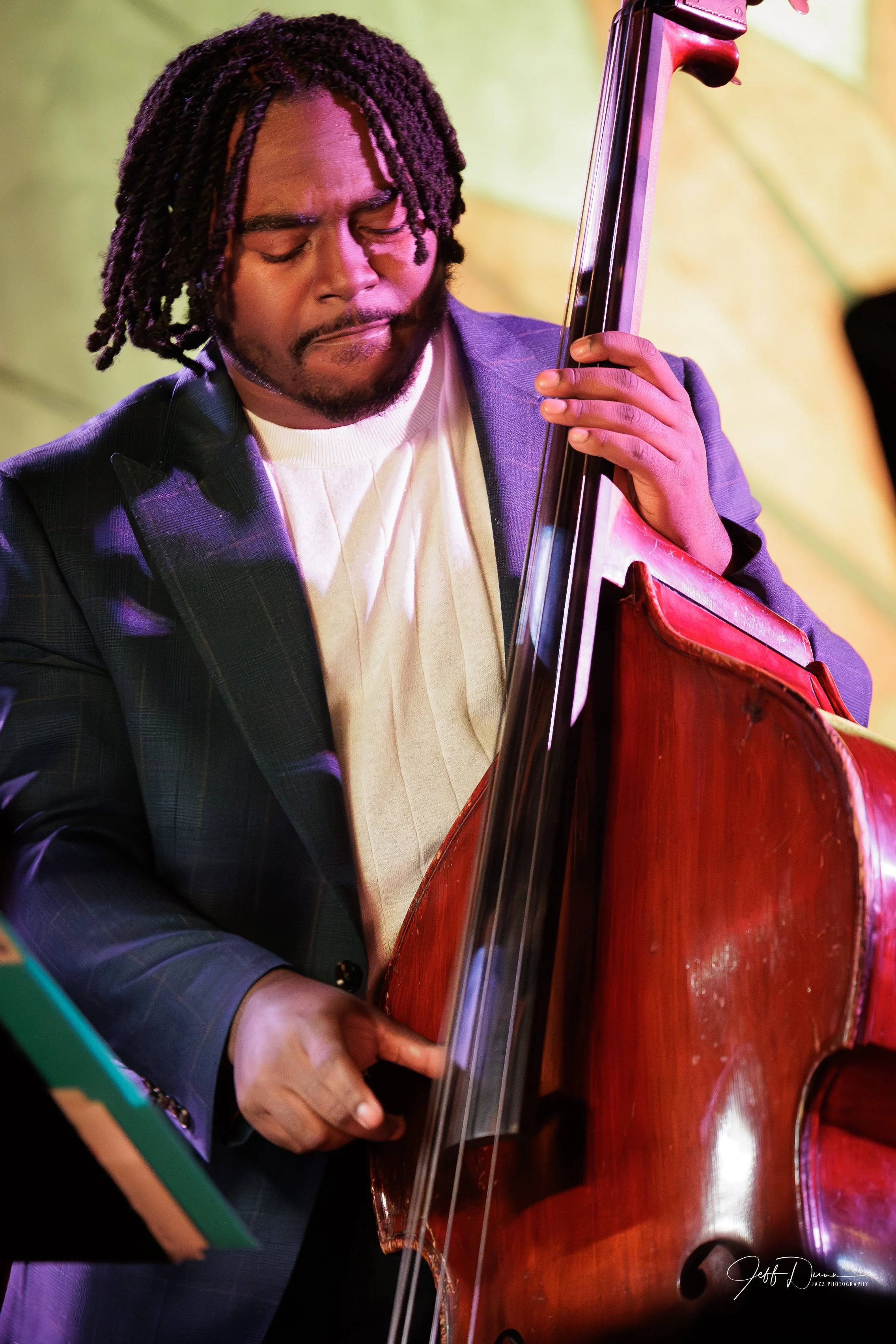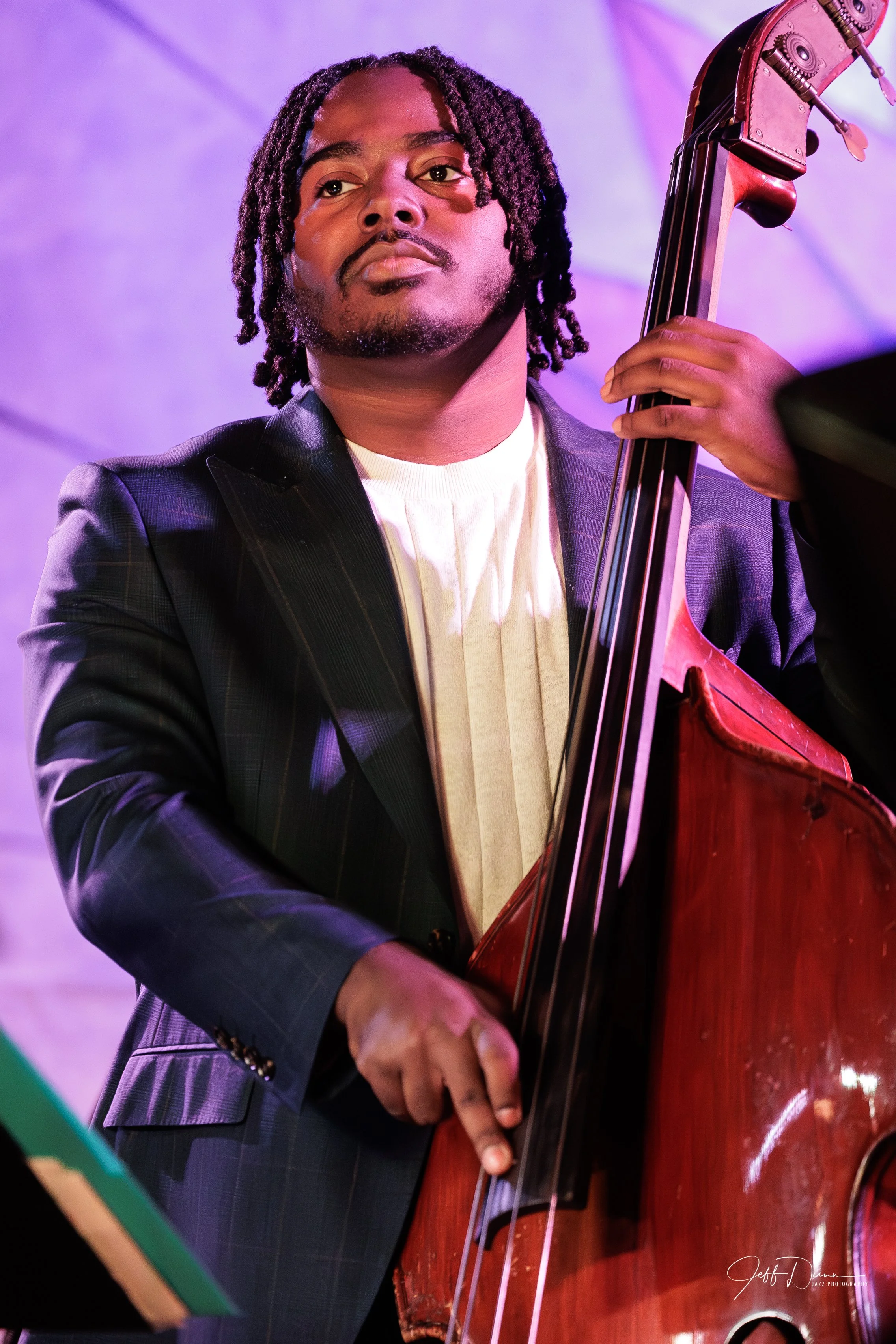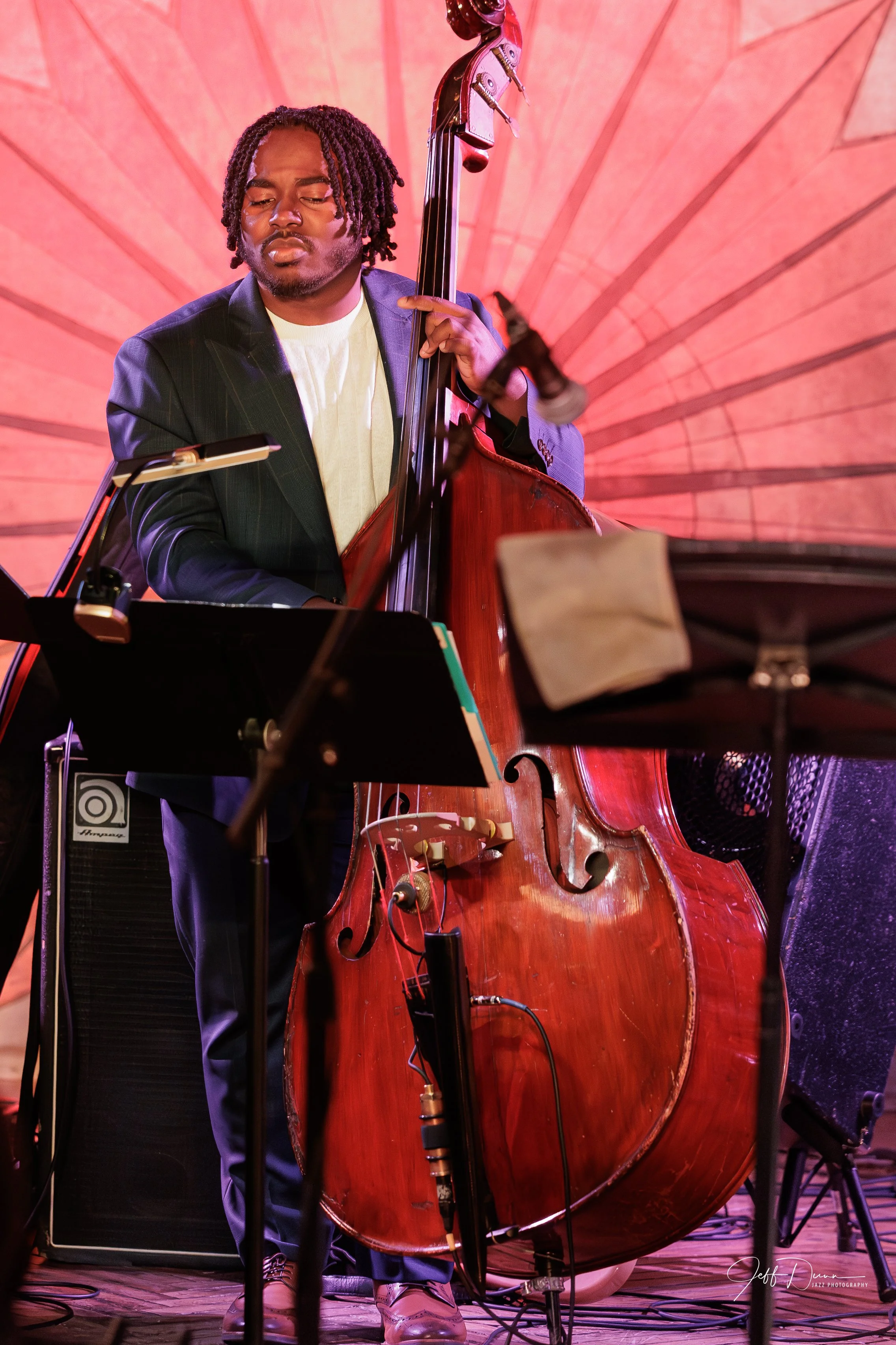 Man playing bass at Detroit Jazz Festival, wearing a suit and glasses.